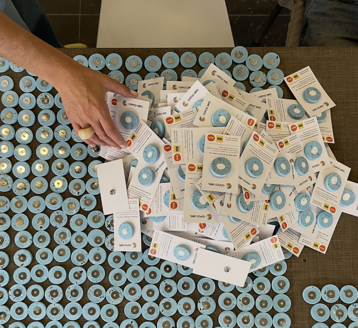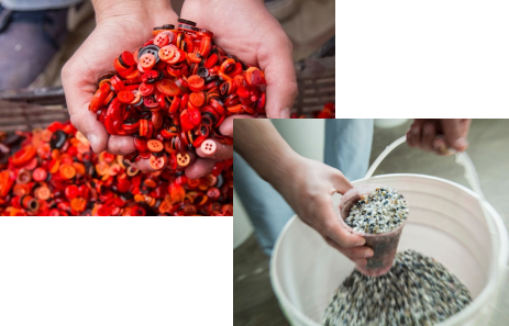 Recolectamos descartes industriales de empresas y los clasificamos para usar en nuevos productos: botones, textiles y otros materiales.